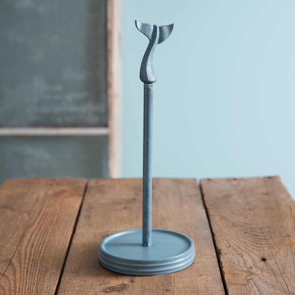 Our Whale Fluke Paper Towel Holder is sure to make a splash on a countertop! Item is made of metal. No matter if you're a landlubber or seafarer, it will bring a touch of the ocean into your home. Whale fluke unscrews to replace paper towels.